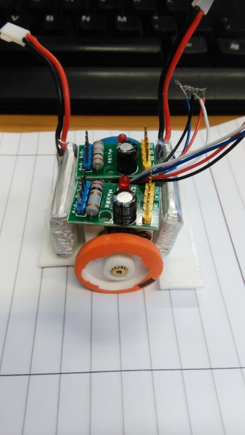 Mini-Me is an attempt at a half-size maze solver. I found these tiny stepper motors on Ebay, and also some simple H-Bridge driver boards. The boards are only make the connections to the motors, no clever chopping or logic. The motors are still driven by interrupt routines on the main chip. I have still got to find out if the motors have enough power to move the mouse!